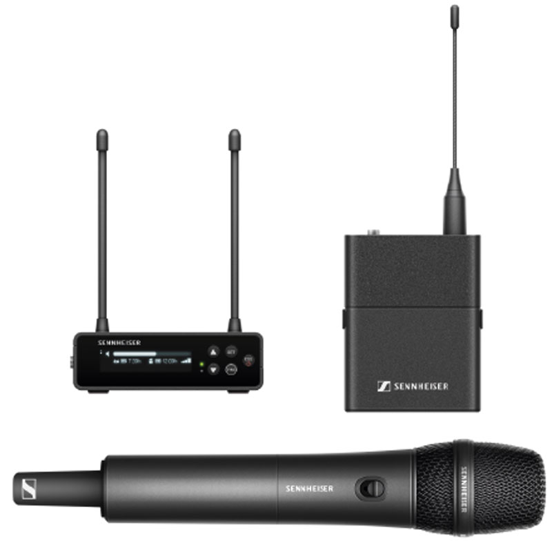 这个组合套装包含如下:1个 EW-DX SKM-S (手持话筒带静音开关), 1 个 MMD 835 音头单元(心形指向, 动圈), 1 个 EW-DX SK (无线腰包发射器), 1 个 MKE 2 (全指向领夹麦克风), 1 台EW-DX EM 2 机架式接收机 (2 通道) 和 2 块BA 70 可充电电池组